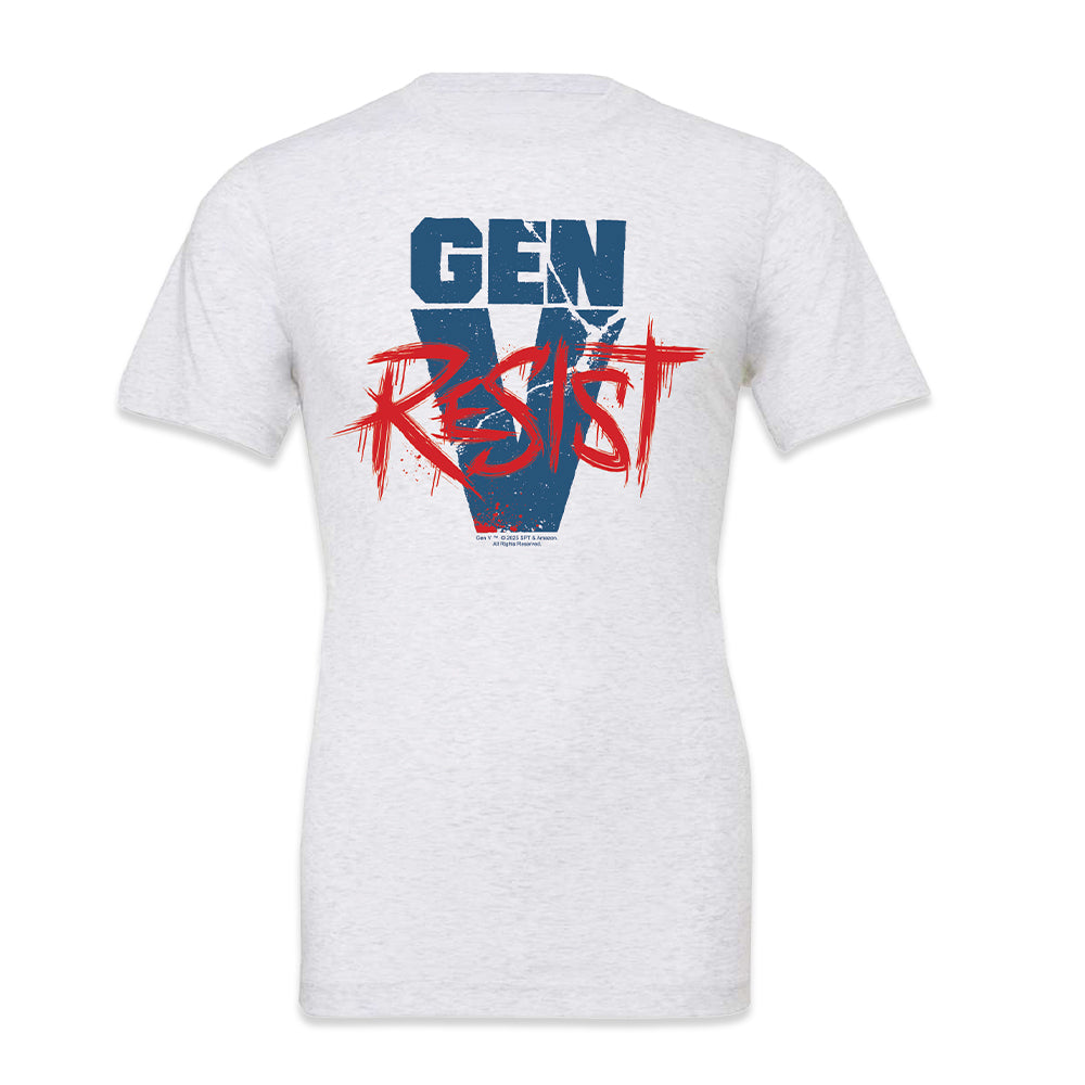 Join the resistance with this light gray tee from Gen V that says "RESIST" on the front.