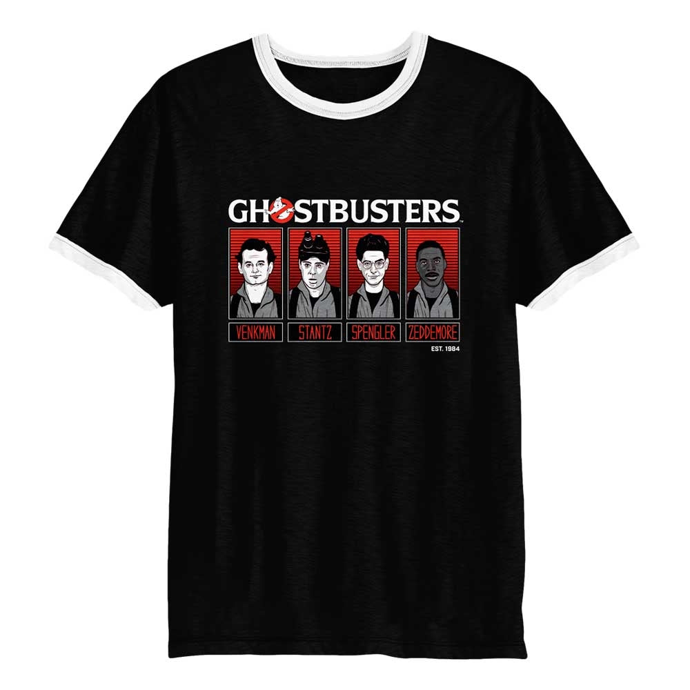 Stand with the fearless Ghostbusters team in this official Ghostbusters Crew black ringer tee. This high-quality t-shirt features Venkman, Stantz, Spengler, and Zeddermore under the Ghostbusters logo. "Est. 1984" tucked under Zeddermore completes the bold design.